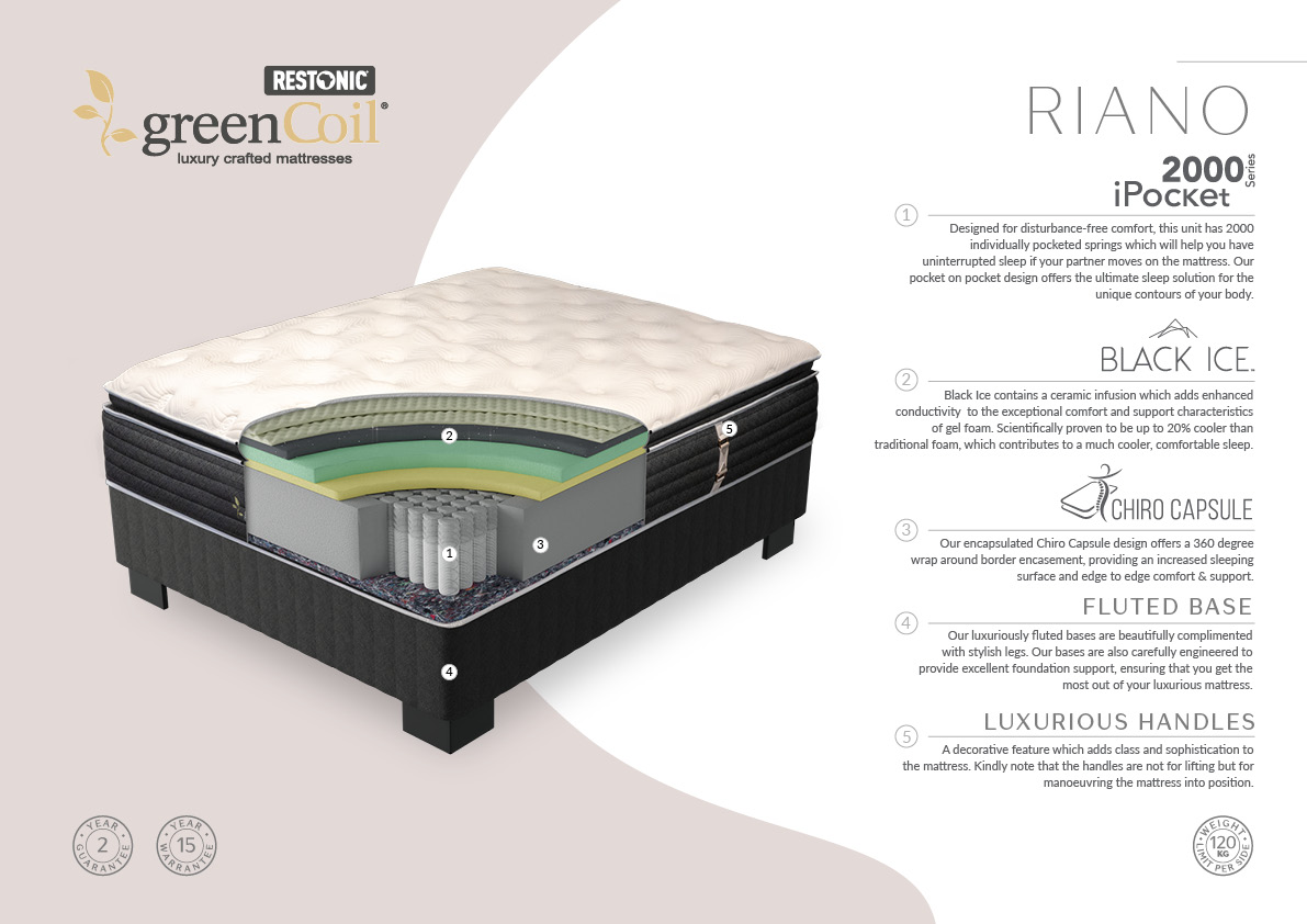 Greencoil Riano offers medium comfort, a 2000 iPocket series, and Chiro Capsule technology for a comfortable and supportive sleep experience