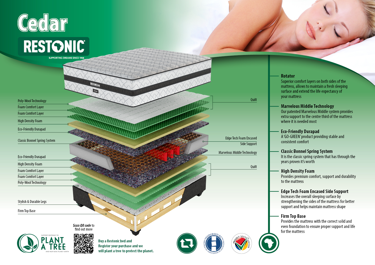 Restonic beds & mattresses are packed with cutting-edge technologies designed to provide the ultimate sleeping experience. Our mattress features supports your ideal body contouring including targeted back & neck support.