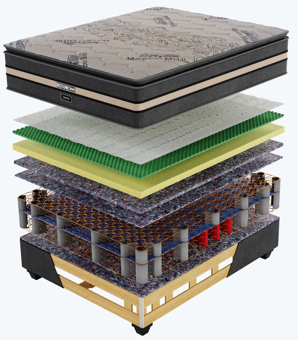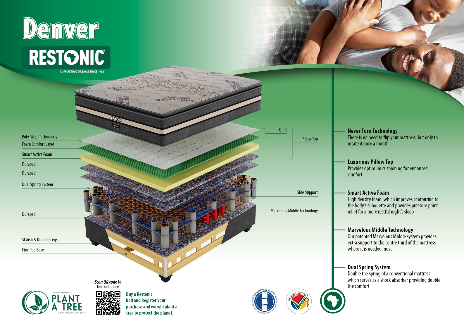 The Restonic Denver bed combines dual spring support, luxurious pillow top, and Smart Active Foam for superior comfort, while Marvelous Middle technology ensures enhanced support and restful sleep.
