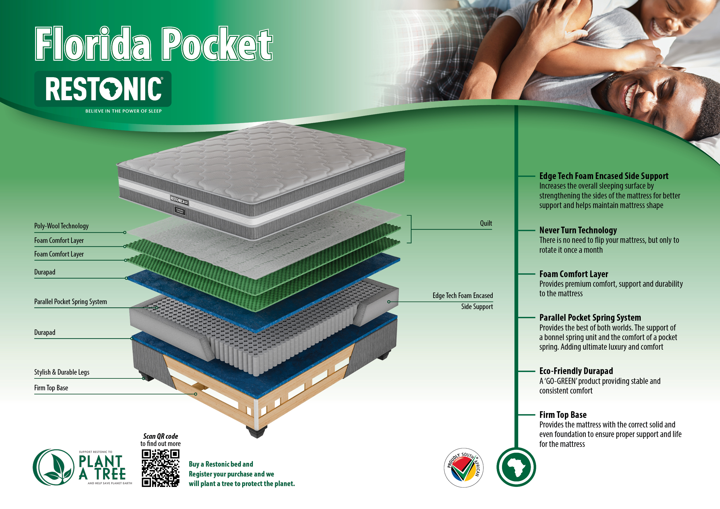 The Restonic Florida Pocket bed provides firm support, eco-friendly comfort, and a parallel pocket spring system for a restful, balanced, and durable night’s sleep.