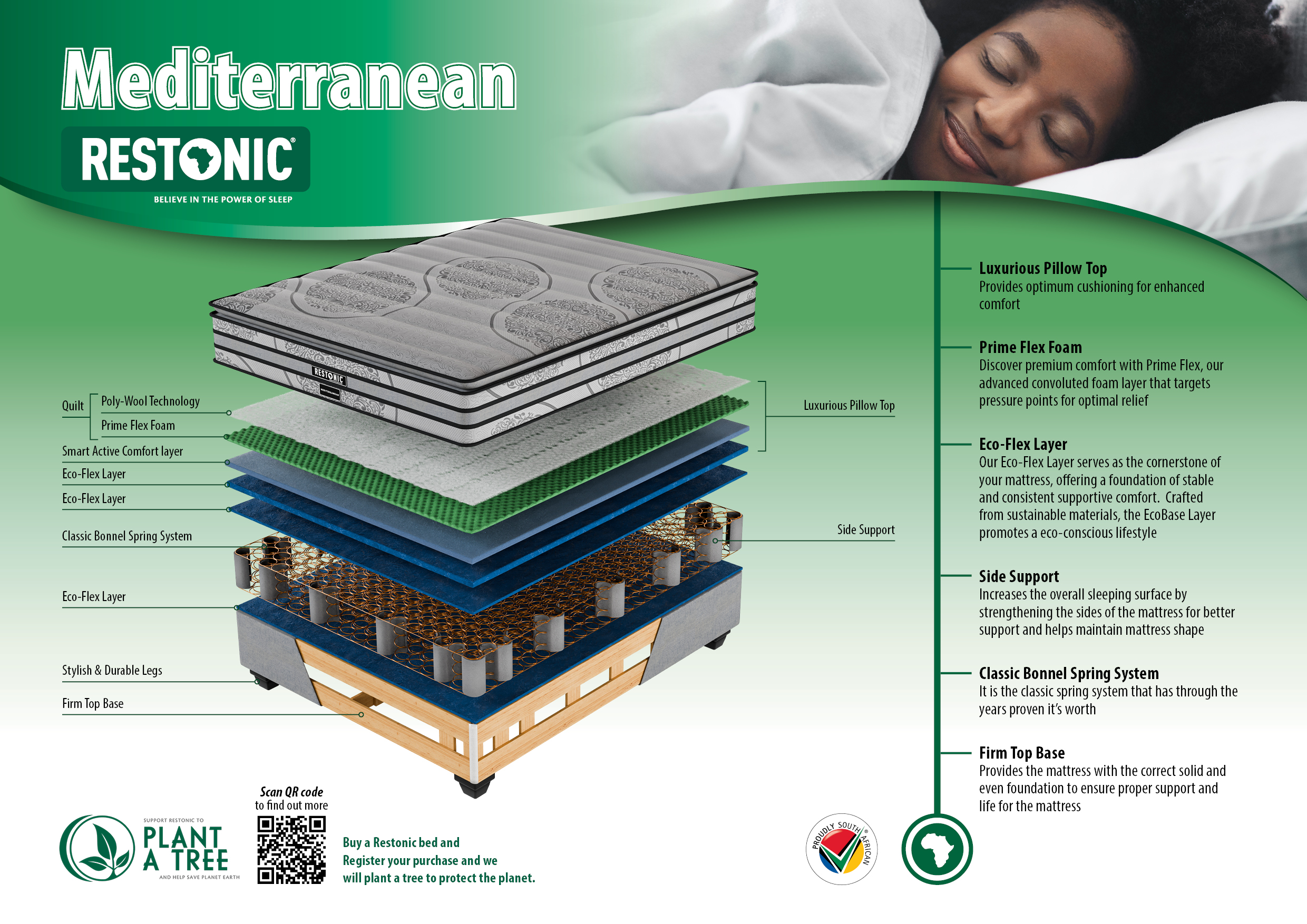 Immerse yourself in the tranquility of the Mediterranean with the Restonic Mediterranean bed. Its luxurious design and exceptional comfort provide a truly restorative sleep experience.