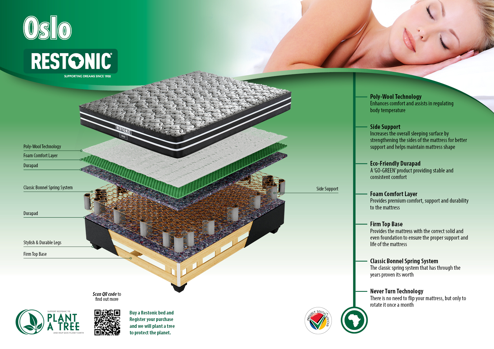 Restonic beds & mattresses are packed with cutting-edge technologies designed to provide the ultimate sleeping experience. Our mattress features supports your ideal body contouring including targeted back & neck support.