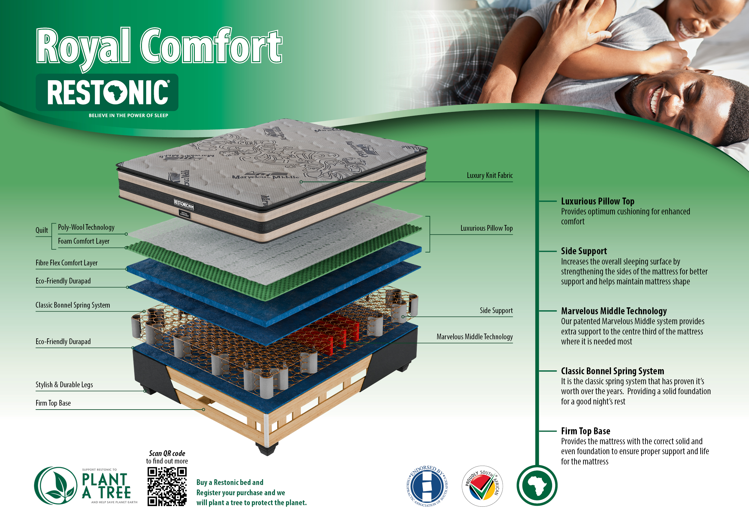 The Restonic Royal Comfort bed combines a luxurious pillow top, firm top base, and classic Bonnel spring system for optimal support and comfort. Its Marvelous Middle technology provides extra support where you need it most, ensuring a rejuvenating, restful sleep every night.