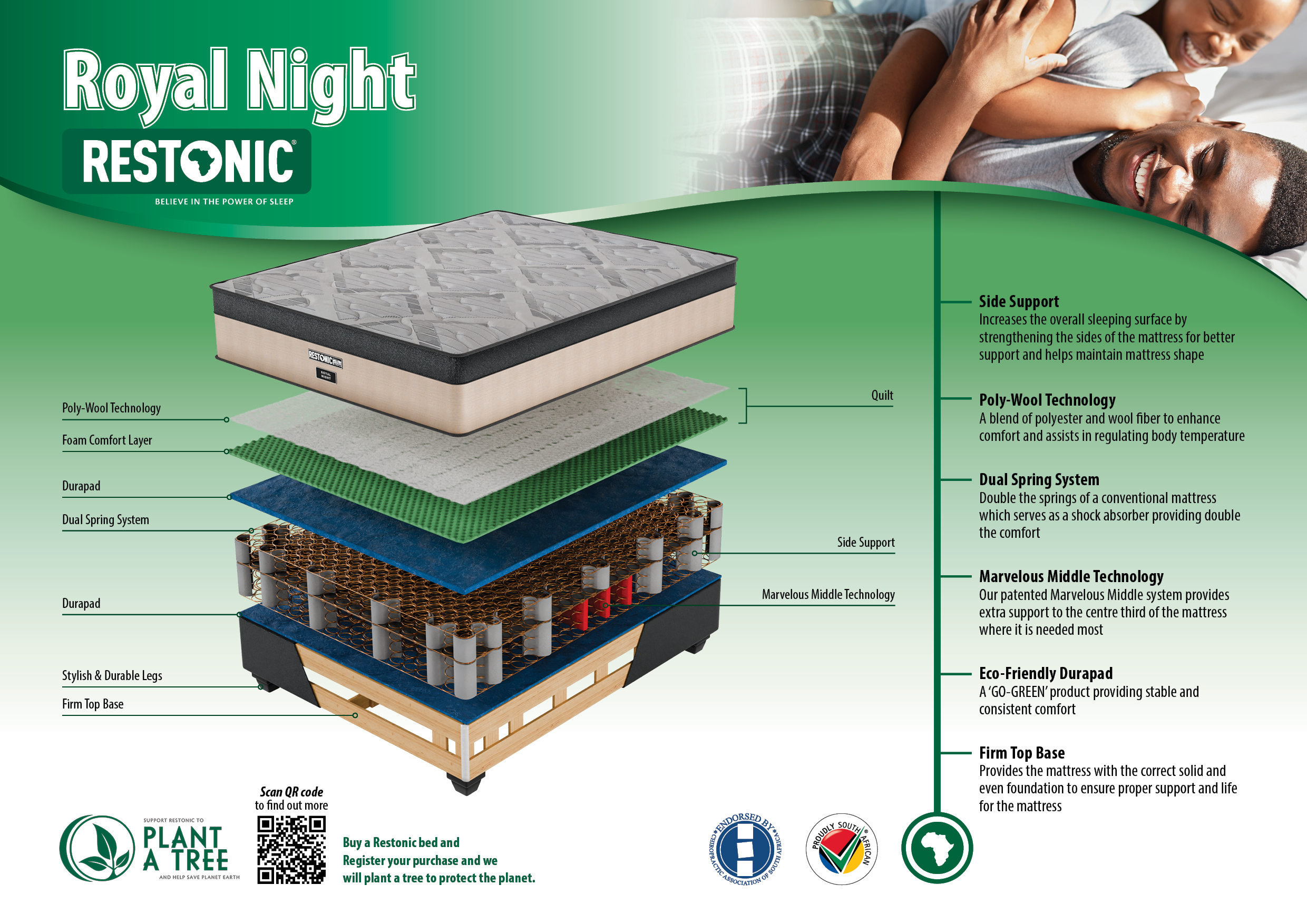 Restonic beds & mattresses are packed with cutting-edge technologies designed to provide the ultimate sleeping experience. Our mattress features supports your ideal body contouring including targeted back & neck support.